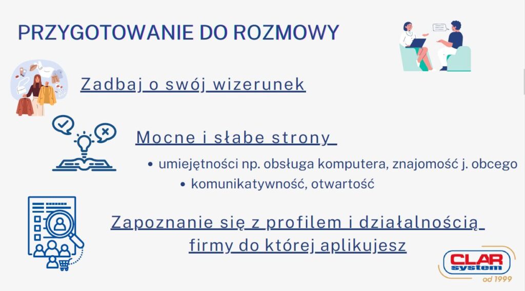 Kluczowym elementem spotkania było zapoznanie uczniów z możliwościami zatrudnienia, które oferuje firma Clar System. Przedstawiono różnorodne stanowiska oraz omówiono umiejętności i predyspozycje, jakie kandydat musi posiadać, aby je objąć – zarówno w pionie usług czystościowych, jak i w pionie usług ochroniarskich. Uczniowie poznali zasady autoprezentacji, dowiedzieli się, jak odpowiadać na trudne pytania i jak budować swój pozytywny wizerunek zawodowy.
